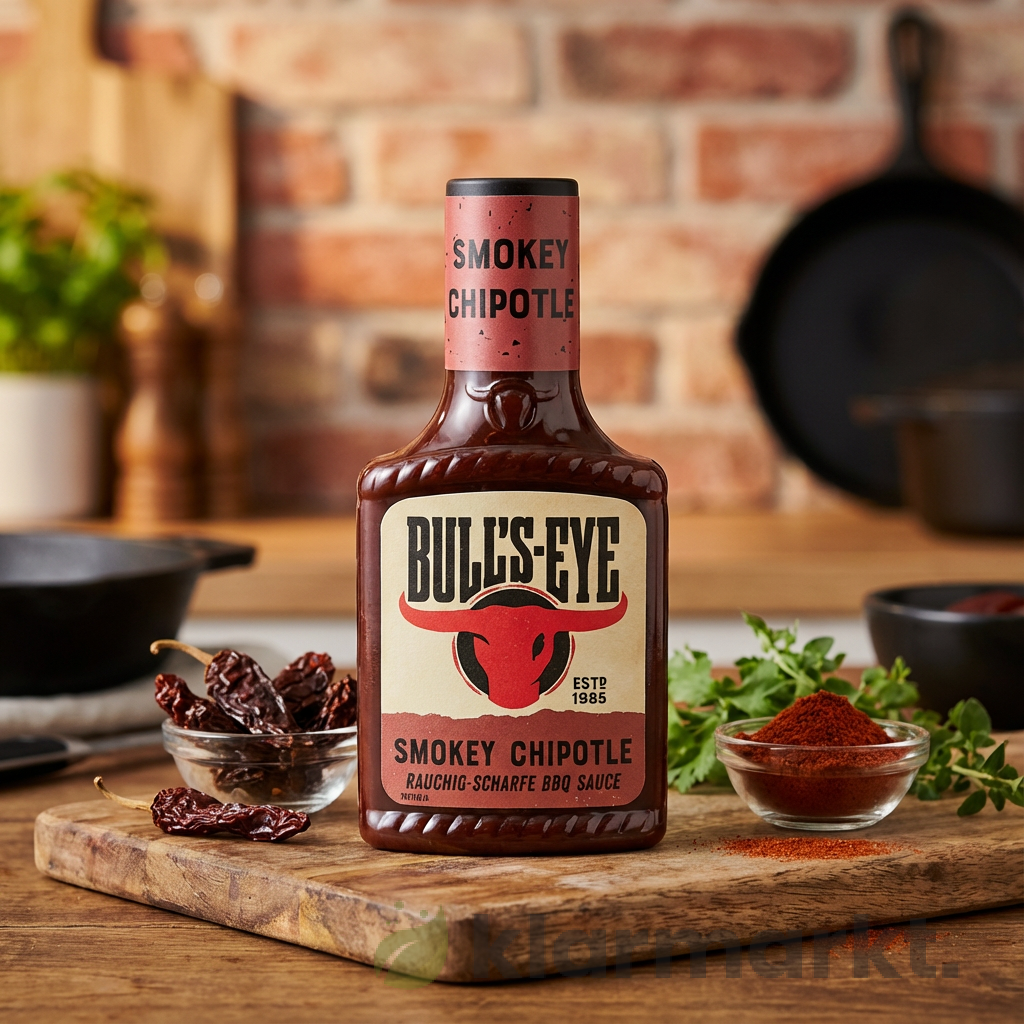 Die Bull’s-Eye BBQ Sauce Smokey Chipotle kombiniert intensives Raucharoma mit der feurigen Schärfe von